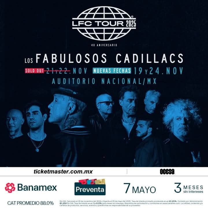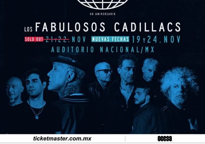 Los Fabulosos Cadillacs agotaron en horas sus shows del 21 y 22 de noviembre. Debido a la demanda, anunciaron dos nuevas fechas: 19 y 24 de noviembre en el Auditorio Nacional. La banda celebra 40 años con una histórica serie de conciertos en CDMX.