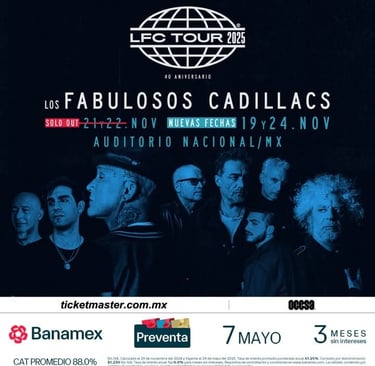 Con las nuevas fechas del 19 y 24 de noviembre, los Cadillacs amplían su celebración para que nadie se quede fuera de esta fiesta histórica. Los boletos ya están disponibles a través de Ticketmaster y en las taquillas del Auditorio Nacional.