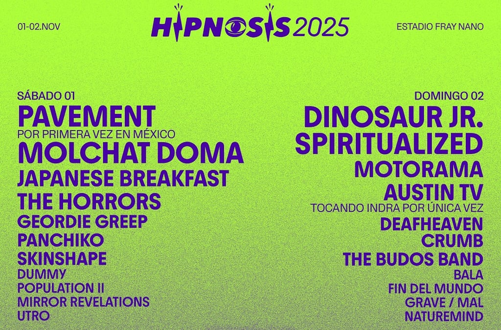 Hipnosis 2025 revela su cartel con Pavement, Molchat Doma, Dinosaur Jr., Spiritualized, Austin TV, Japanese Breakfast y más. El festival se celebrará el 1 y 2 de noviembre en el Estadio Fray Nano, prometiendo dos días de pura psicodelia y rock alternativo.
