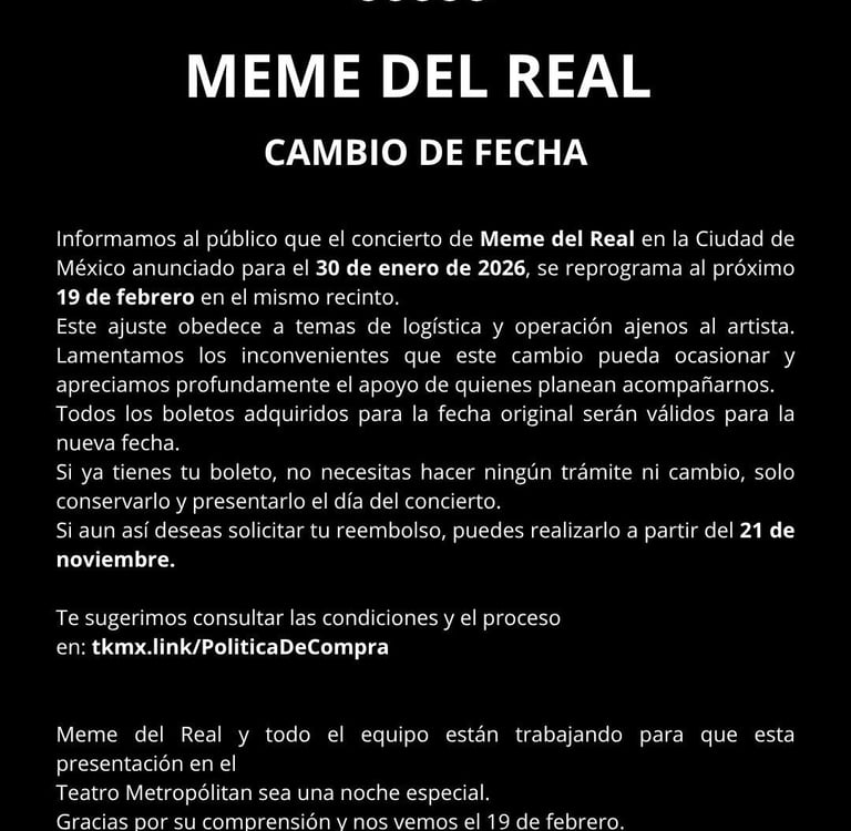 El concierto de Meme del Real en la Ciudad de México ha sido reprogramado. La presentación, originalmente anunciada para el 30 de enero de 2026, se llevará a cabo ahora el 19 de febrero de 2026, manteniendo como sede el Teatro Metropólitan.