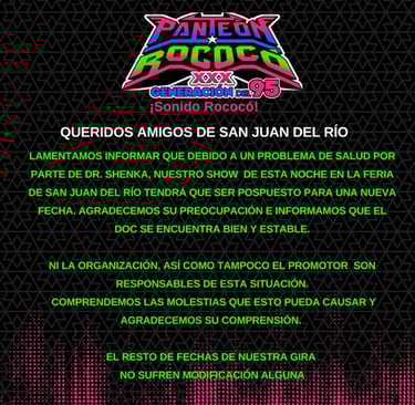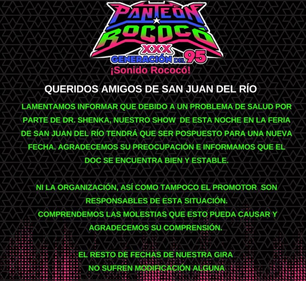 Panteón Rococó suspendió su concierto en San Juan del Río debido a un preinfarto de Dr. Shenka. La banda informó que el vocalista se encuentra estable y que el show será reprogramado. Aclararon que ni la organización ni el promotor son responsables. El resto de la gira sigue sin cambios.
