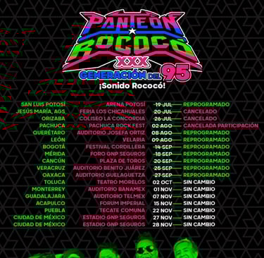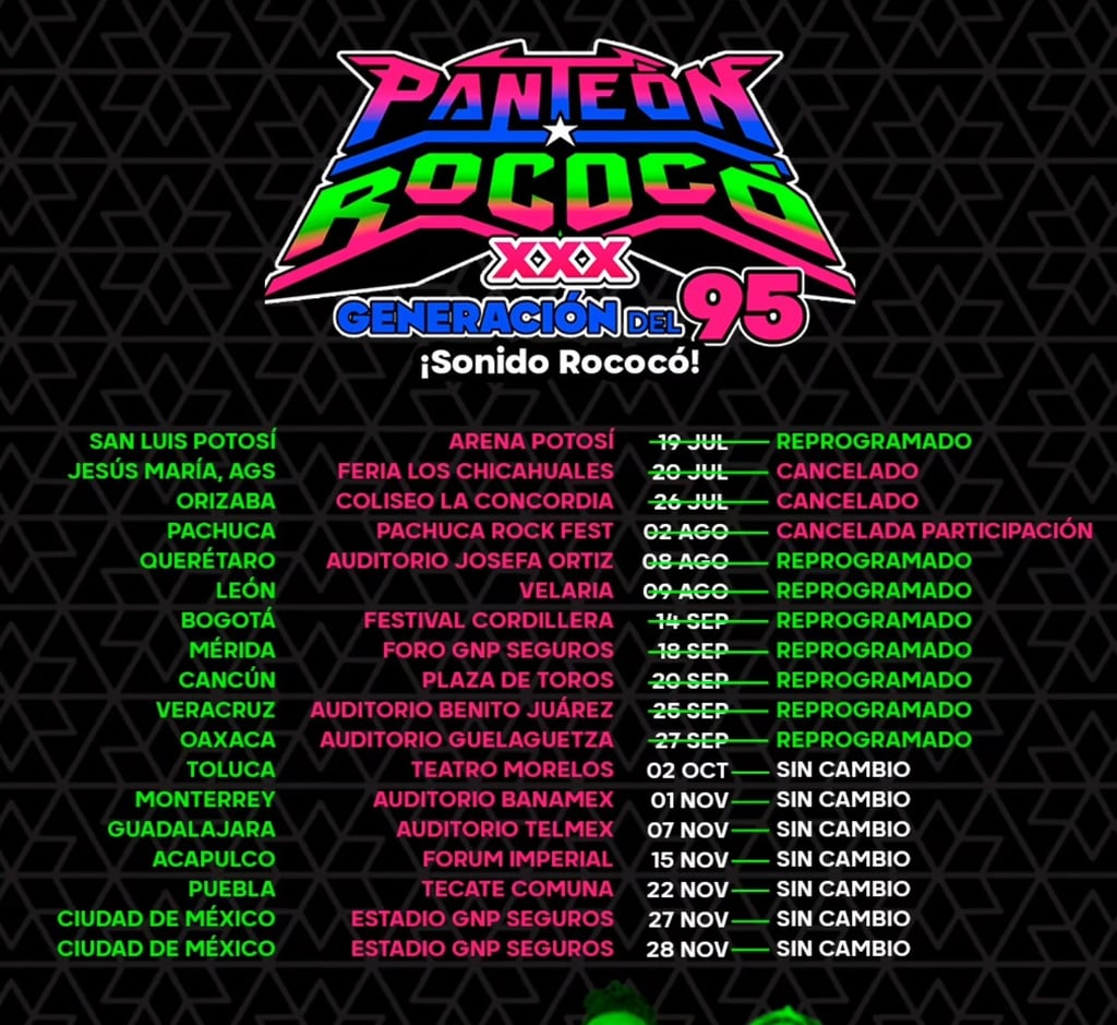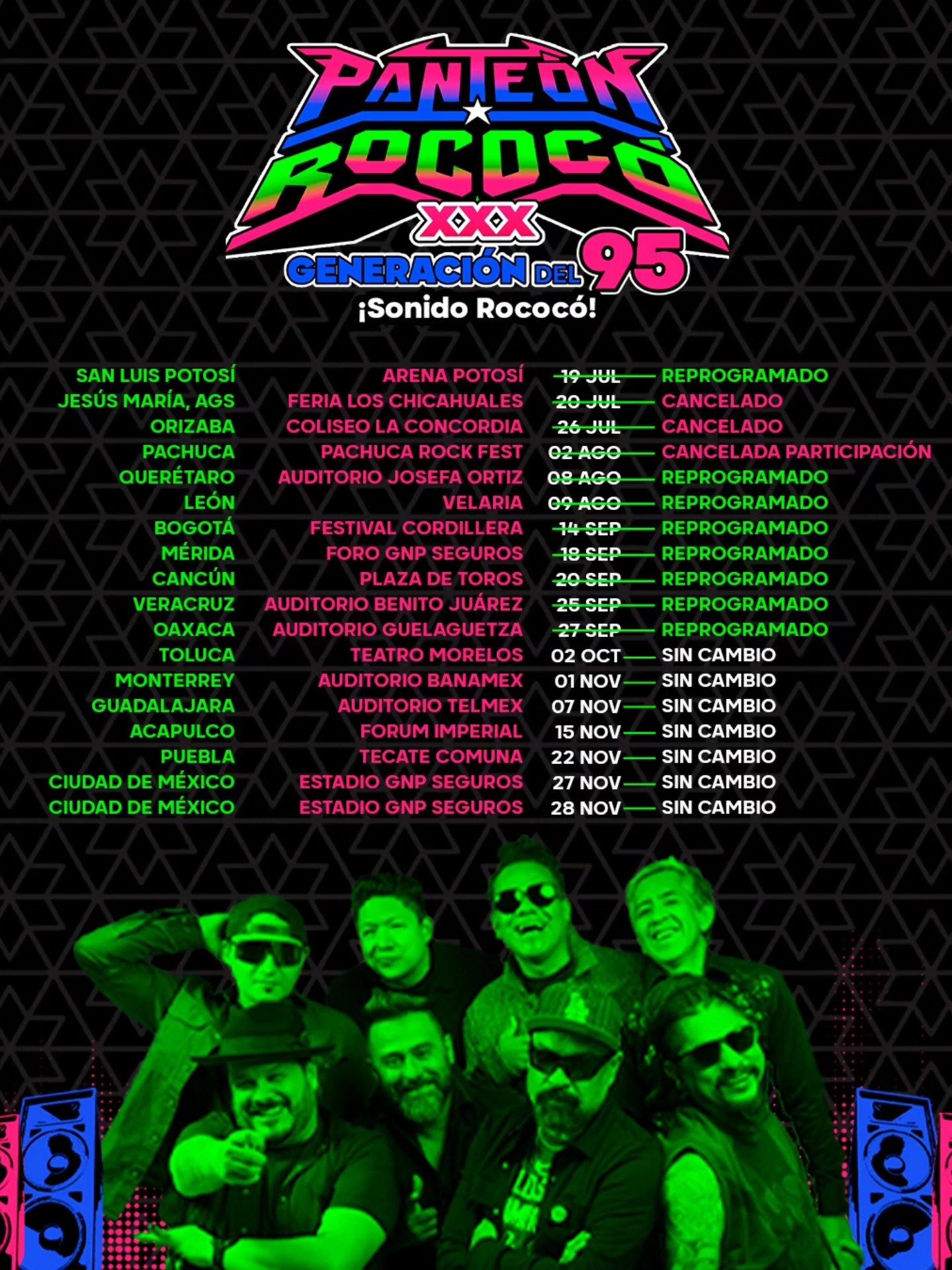 Este 3 de julio, Panteón Rococó anunció oficialmente la reprogramación y cancelación de varias fechas de su gira Generación del ’95, luego del problema de salud que recientemente enfrentó su vocalista, Dr. Shenka, quien sufrió un preinfarto que obligó a detener temporalmente las presentaciones.