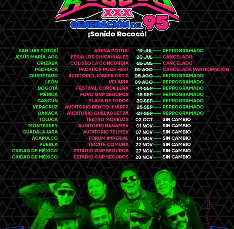 Por otro lado, varias fechas importantes siguen sin cambios, incluyendo las de Toluca (02 oct), Monterrey (01 nov), Guadalajara (07 nov), Acapulco (15 nov), Puebla (22 nov) y las dos grandes presentaciones en el Estadio GNP Seguros de la CDMX el 27 y 28 de noviembre.
