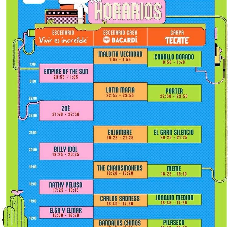 Los actos principales incluyen a Empire of the Sun, Zoé, The Chainsmokers, Billy Idol, Latin Mafia, Nathy Peluso, Bandalos Chinos, entre muchos otros, en un lineup que combina rock, pop, electrónica y propuestas frescas de la escena latina.