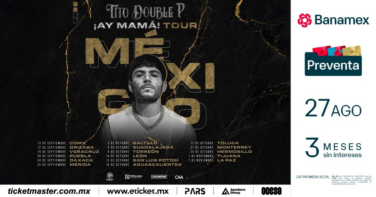 Tras conquistar EE. UU. con 27 shows sold out, Tito Double P aterriza en México con su gira ¡AY MAMÁ!, 17 fechas de septiembre a noviembre con hits como “TATTOO” y “ROSONES”. Una oportunidad única para vivir su fuerza en vivo.
